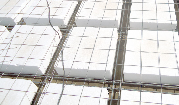 Los nervios de hormigón armado se disponen en dos direcciones perpendiculares entre sí, incorporando entre estos nervios los casetones de Poliestireno Expandido.